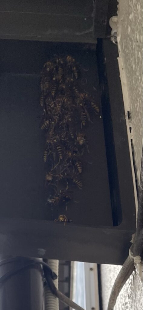 で、よく見てみると巣はなさそう。ハチ達も飛び回るでもなくおとなしい感じで、気づかなかったとはいえ至近距離でスプレーをシュッシュッと窓拭き作業をしてても襲ってくる訳でもなく身を寄せ合って固まっていました。