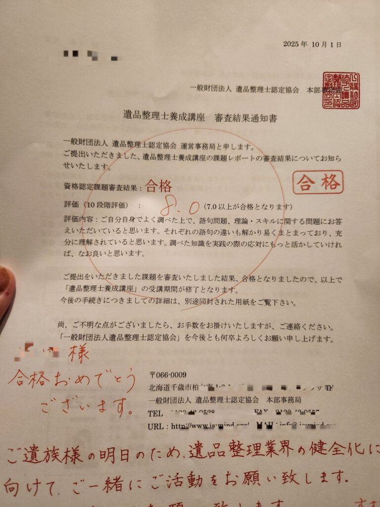 遺品整理について、しっかり勉強し、無事「遺品整理士」の資格を取得しました!