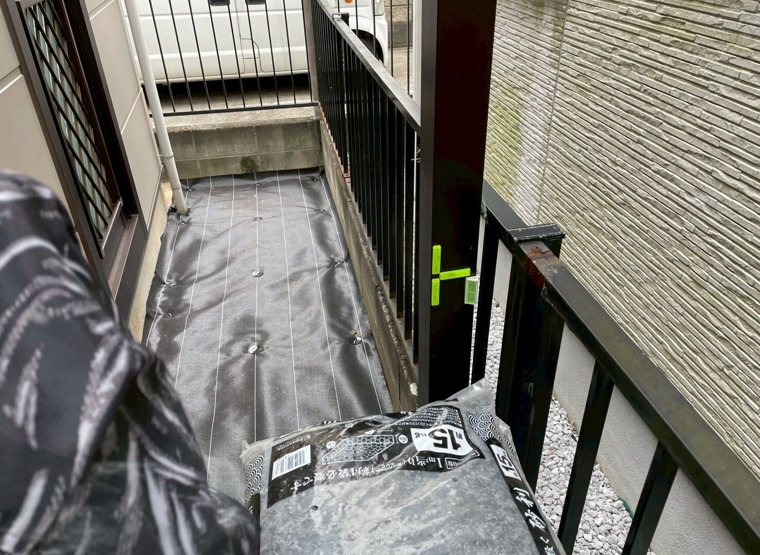 残置物を片付け、しっかりと雑草を取り除き、下地を整えて防草シートを施工。