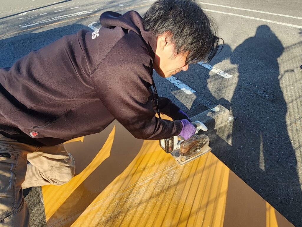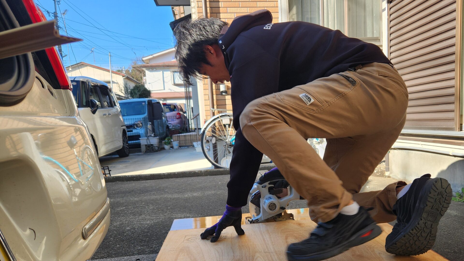 その場で板を半分にカットし、現場へ戻って作業開始。