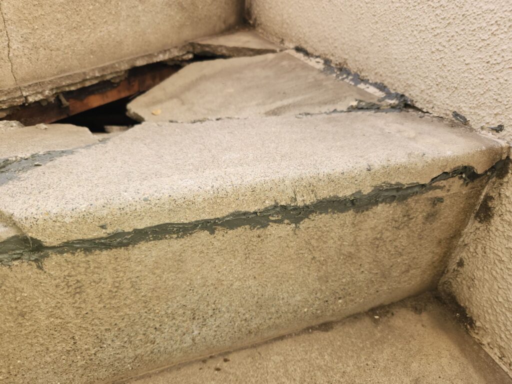 コンクリート部分に亀裂が入り、そこから雨水が侵入。