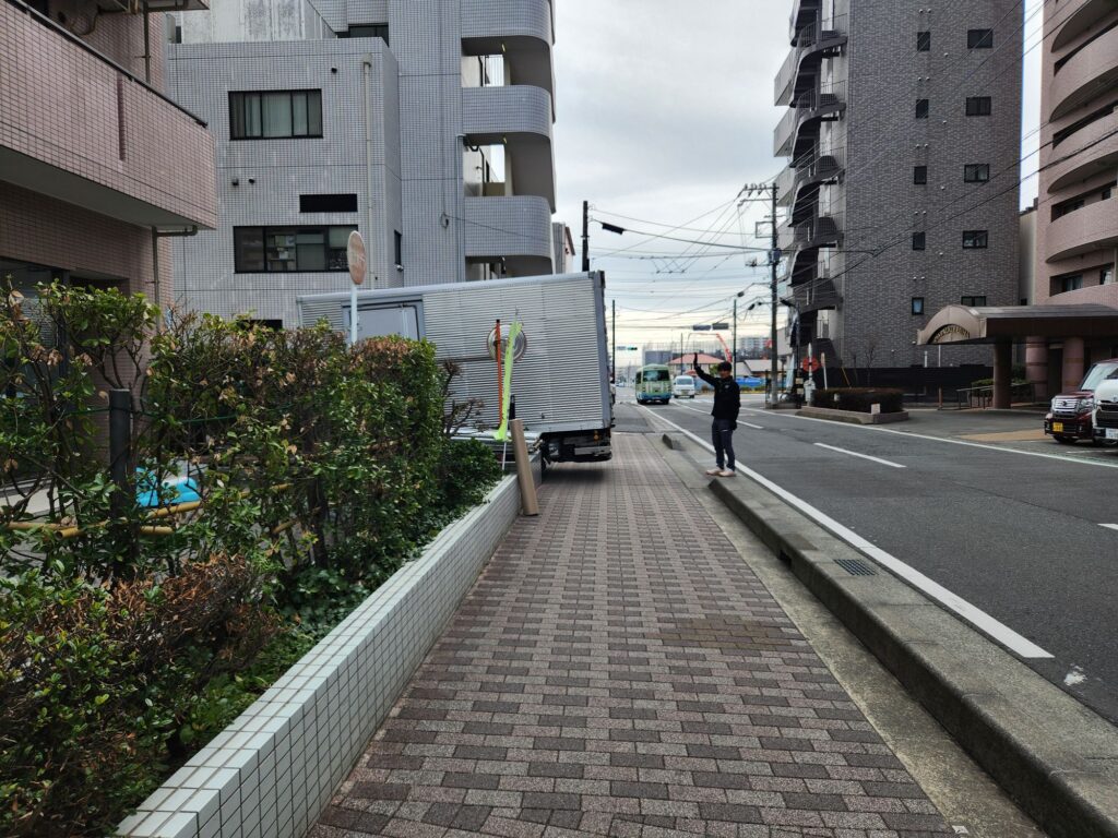 人通りの多い道では歩行者や自転車にしっかり目を配りながら誘導し、見通しの悪い道路では必ず「こっちは大丈夫」と声をかける。左右の安全確認も徹底しています。