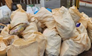 袋にまとめられているゴミをすべて一度開けて広げ、そこからひとつひとつ分別し、再び袋詰め。