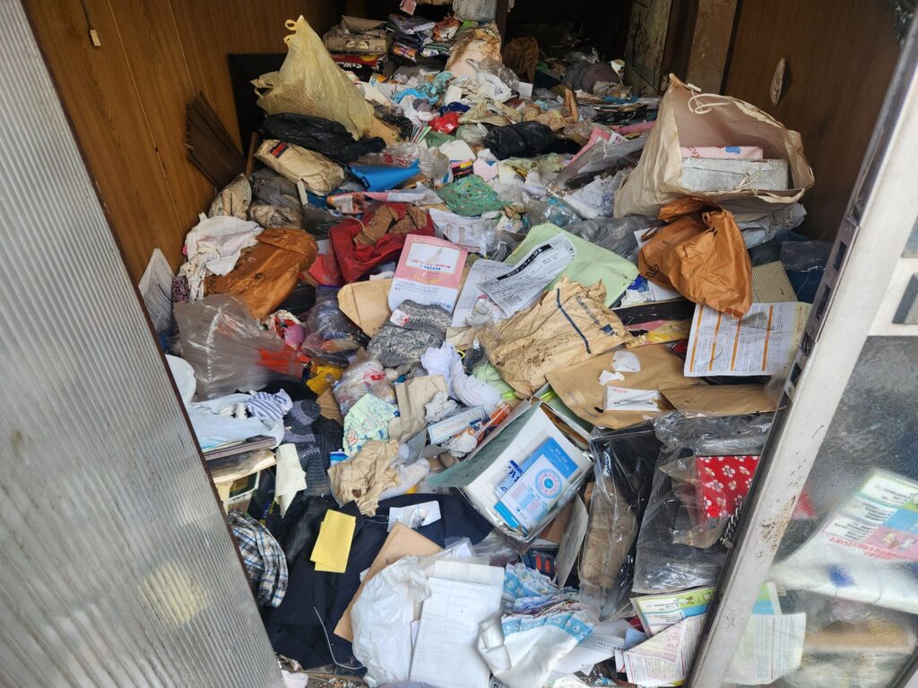 長年積み重なっていたごみが、ある意味“支え”になっていたようで、撤去が進んだことで手すりが折れてしまっている階段はさらに不安定な状態に。