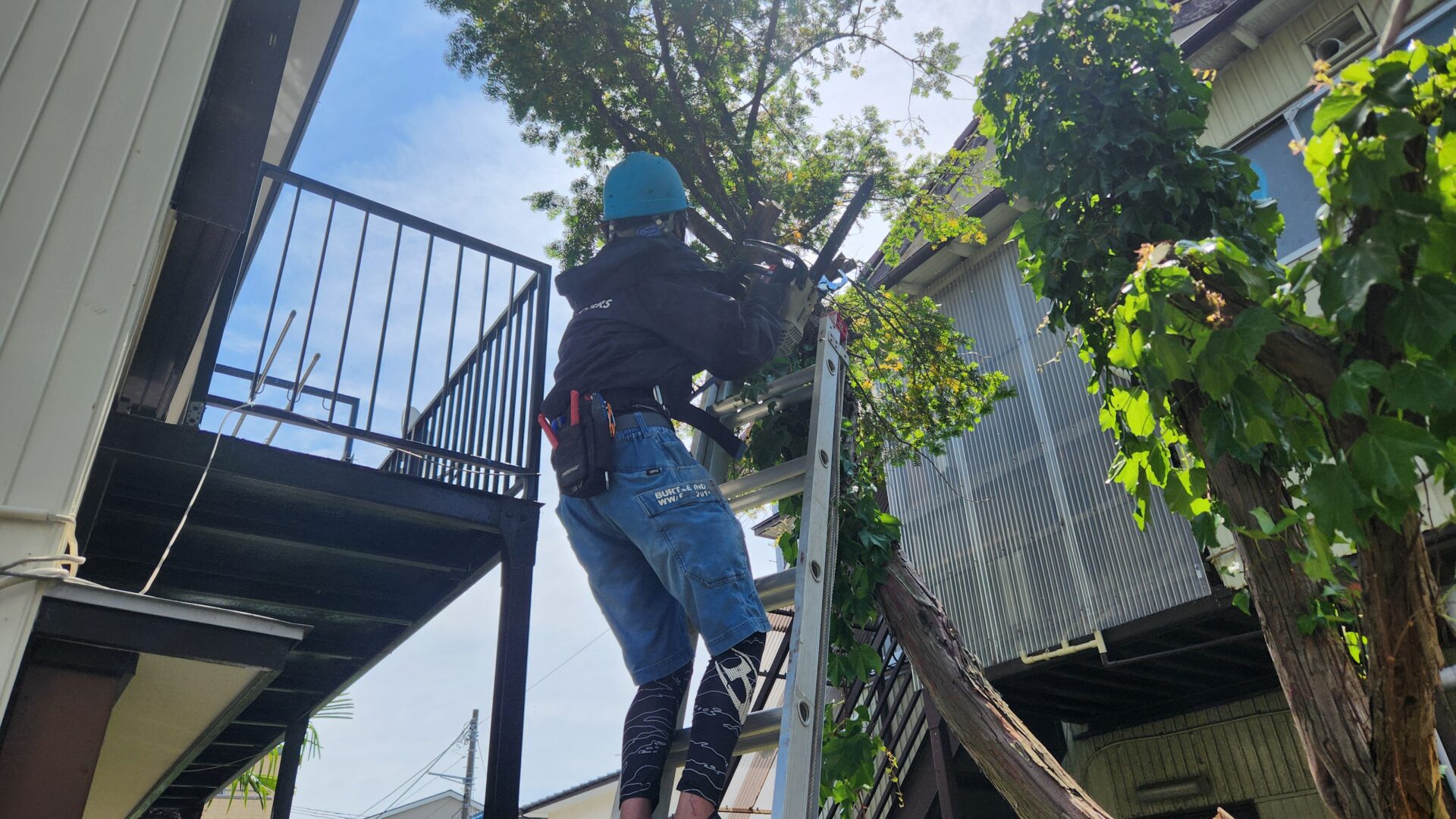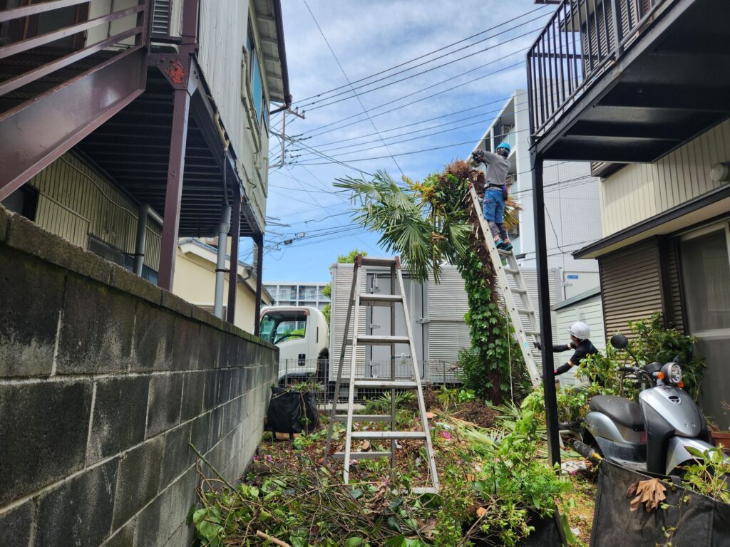 今回の主役は、2階の高さまで伸びきったシュロの木。なんだか手強そう…
